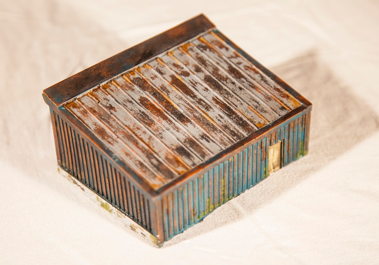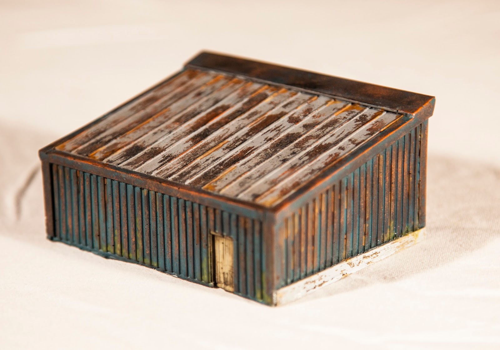 Leave the final paint layer to dry and then with a brush apply clean water to the area you want the top coat scraped back from and carry on massaging the water into the top coat until the paint starts to lift away… this is how I got the distressed wood look on the front, the rusty walls on the other three sides and the rusted galvanised roof on top.