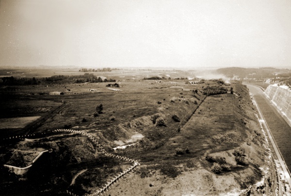 Eben-Emael was built between 1932 and 1935 in the style of the Maginot Line fortifications. Its construction was based on the Albert Canal’s cut through a 1,300-meter-wide hill, located 6 km south of Maastricht. The fortress was blasted into the natural rock of the western bank of the canal, which reaches its highest point about 65 meters above the water level. The bank slope, which slopes steeply down to the cut, became the eastern front of the fortress. The fortress’s layout followed the irregular contours of the hill, whose natural form was not altered by the construction. Eben-Emael was therefore a fortification of its own kind, featuring neither large concrete structures nor special walls. Its underground area covered almost 65 hectares.