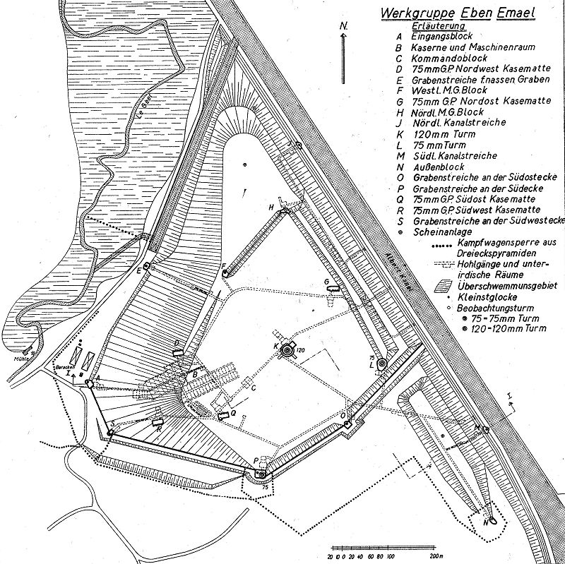Eben-Emael’s outer defences, which mostly served as flanking defences, consisted of six smaller bunkers and two dugouts (north and south) with a total of eleven 60 mm anti-tank guns, 16 twin machine guns, and four light machine guns. Additional light machine guns were positioned inside the fortress. In total, Fort Eben-Emael’s armament consisted of two 120 mm guns, sixteen 75 mm guns, twelve 60 mm guns, 25 twin machine guns, six anti-aircraft machine guns, and approximately 12 light machine guns.