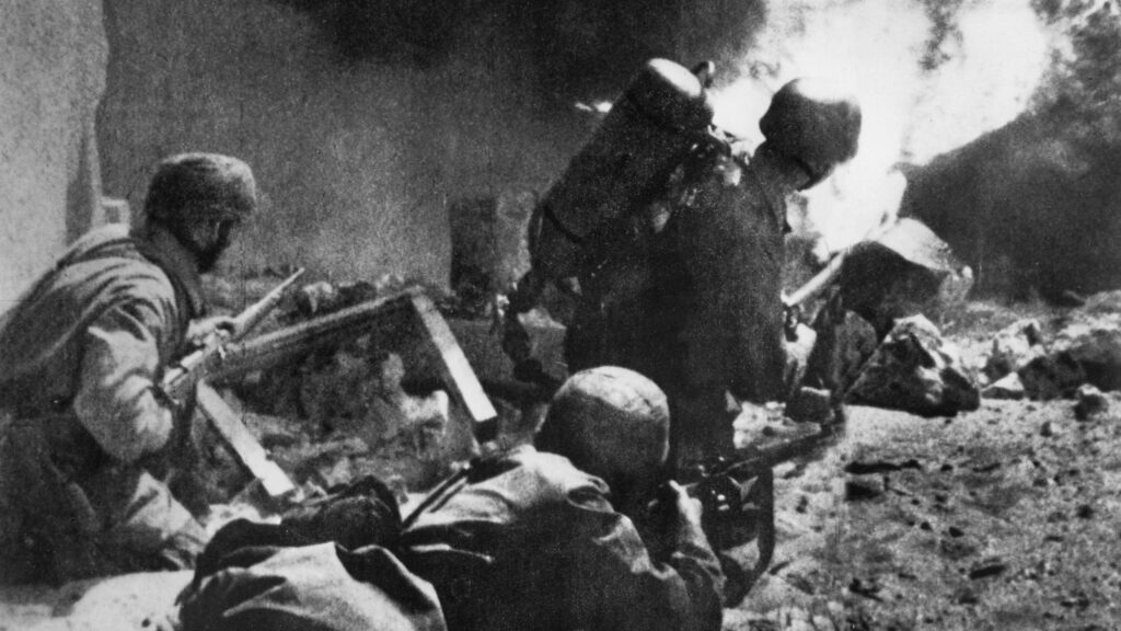 Wenzel’s team approached GFM B, which opened up on them the moment they were spotted. The Germans dropped flat and returned fire, bullets pinging off the domed cupola like rain on a kettle. Creeping forward under cover, Wenzel hurled a grenade, forcing the crew to button up. In those crucial seconds, his assistant slapped a shaped charge directly onto the viewing slit. The blast severed vision, vent, and morale in one go.