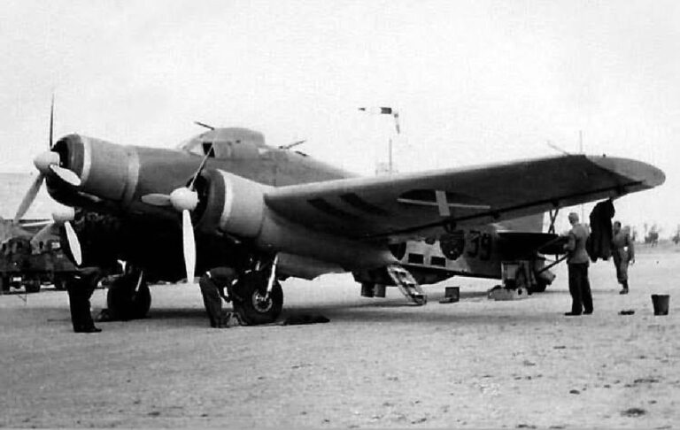 The Fiat BR.20 was developed in the mid-1930s as a twin-engine medium bomber with stressed-skin metal construction and a twin-fin tail configuration. Powered by radial engines mounted in streamlined nacelles, it featured internal bomb stowage and defensive gun positions, reflecting contemporary European bomber design thinking focused on speed, structural strength, and medium-range strike capability.